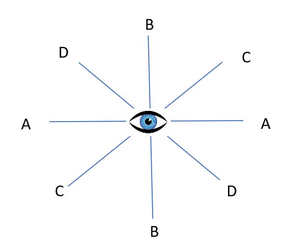 Ćwiczenie wykonujemy z jednym okiem zasłoniętym. W ręku należy trzymać np.: ołówek z gumką lub drut z kulką na końcu. Głowę trzymamy prosto, nieruchomo. Kulkę umieszczamy 30 centymetrów od oka i wodzimy wzrokiem za przemieszczającą się kulką. W maksymalnym wychyleniu musi być dyskomfort, ale nie może być bólu. W skrajnej pozycji pozostajemy około 30 sekund. Przemieszczamy kulkę pomiędzy skrajnymi punktami gwiazdki (od A do A, od B do B itd.) tak jak pokazałem to na rysunku poniżej:
