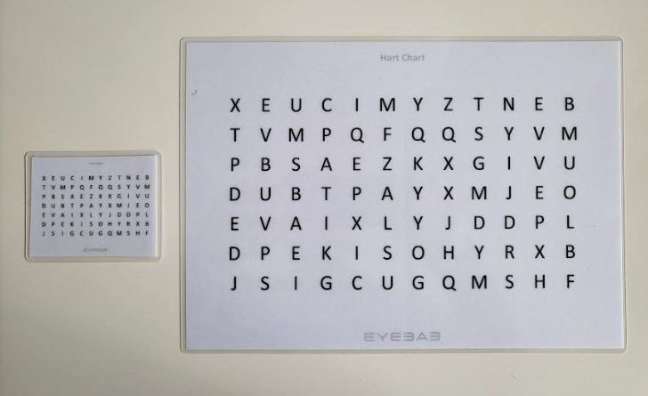 Dużą kartkę wieszamy na ścianie w odległości około 2-3m na wysokości wzroku. Stajemy przed ścianą (2-3m) w wyciągniętej ręce trzymamy zalaminowaną kartkę małą. Koncentrujemy wzrok na pierwszej literze w pierwszym rzędzie przez 20 sekund, następnie przenosimy wzrok na duża kartkę na ścianie i koncentrujemy wzrok na 1 literze w pierwszym rzędzie na dużej kartce. Powinniśmy czuć rozluźnienie mieści oka, patrzymy na dużą kartkę, aż do pełnego uczucia rozluźnienia. Powtarzamy przez cały czas trwania ćwiczenia.